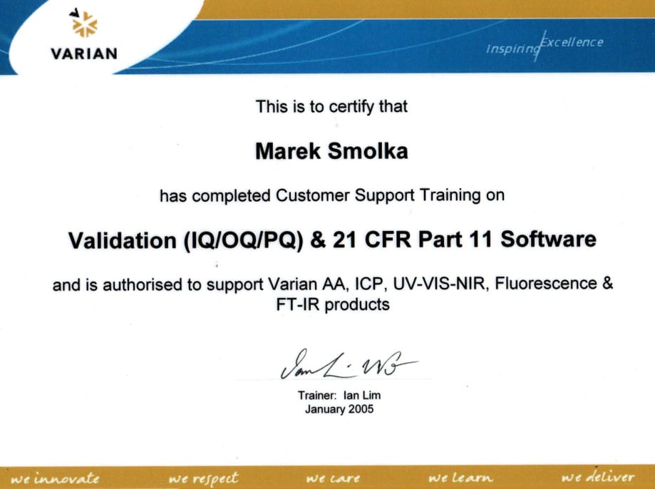 Inżynier serwisowy Marek Smołka posiada niezbędne certyfikaty odbytych szkoleń obejmujących obsługę techniczną, informatyczną programów sterujących, a także nadających uprawnienia do przeprowadzania testów walidacyjnych wymaganych w laboratoriach posiadających akredytację.